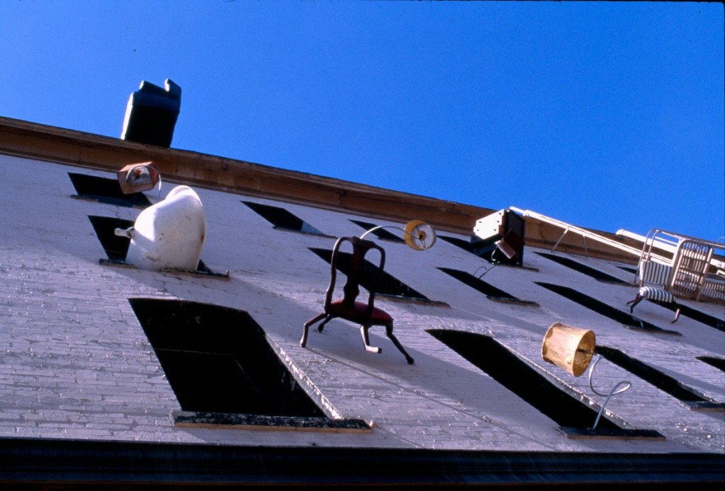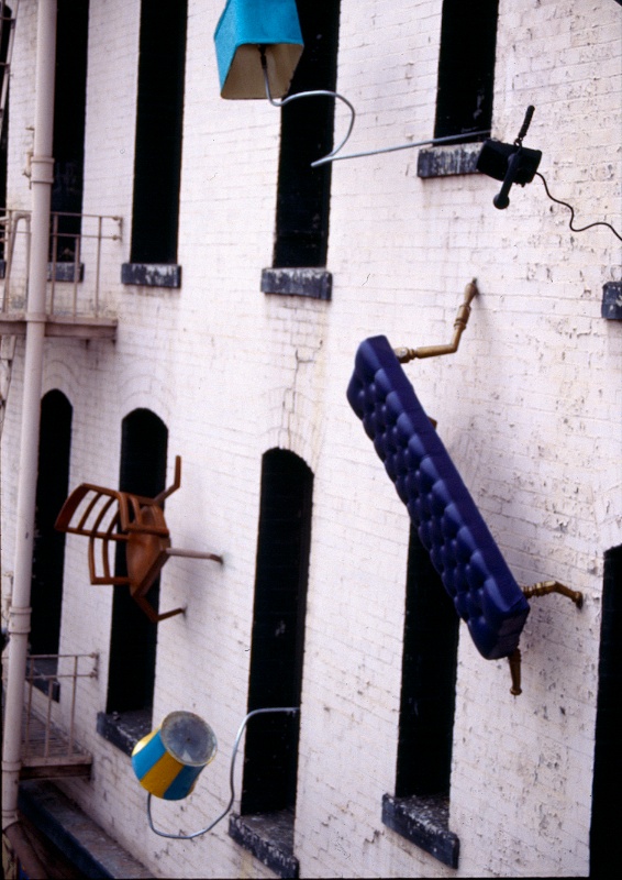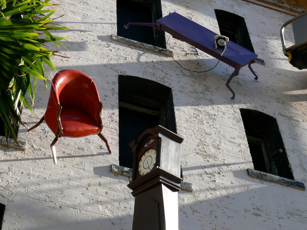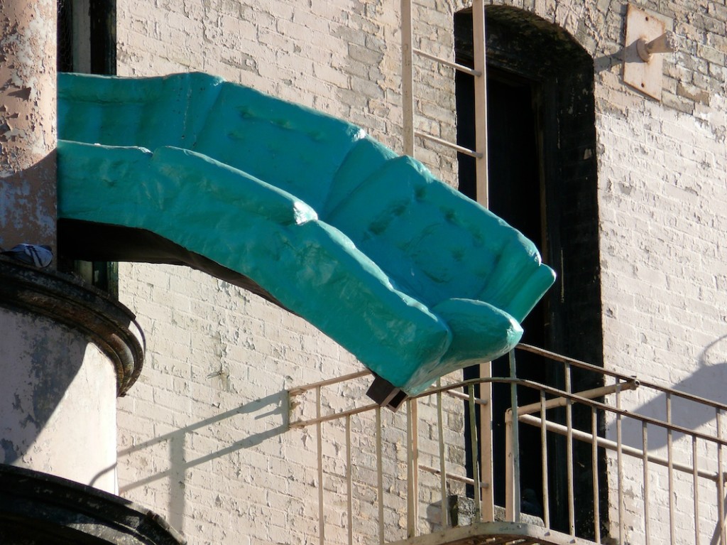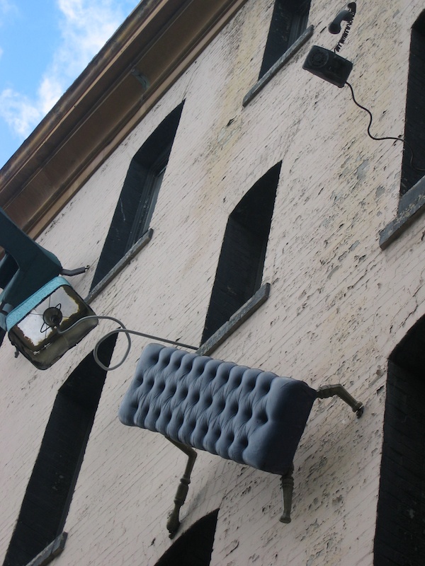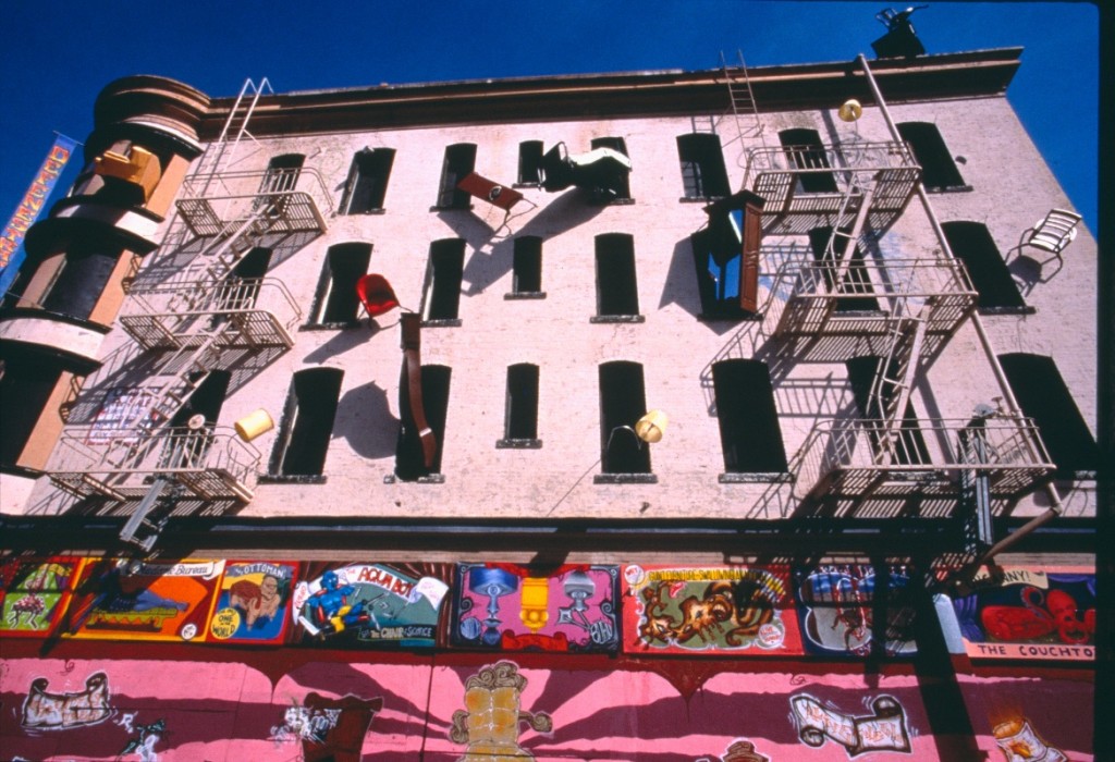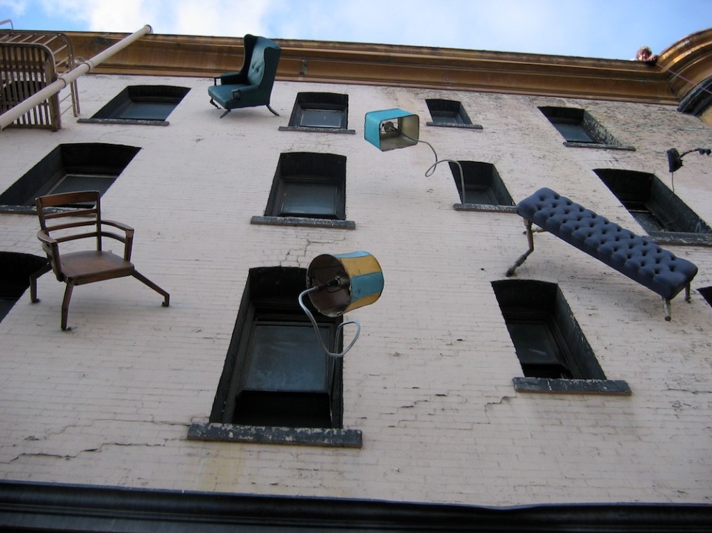 This multi-disciplinary sculptural mural involves seemingly animated furniture; tables, chairs, lamps, grandfather clocks, a refrigerator, and couches, their bodies bent like centipedes, fastened to the walls and window-sills, their insect-like legs seeming to grasp the surfaces. Against society’s expectations, these everyday objects flood out of windows like escapees, out onto available ledges, up and down the walls, onto the fire escapes and off the roof. “DEFENESTRATION” was created by Brian Goggin with the help of over 100 volunteers.