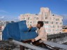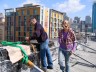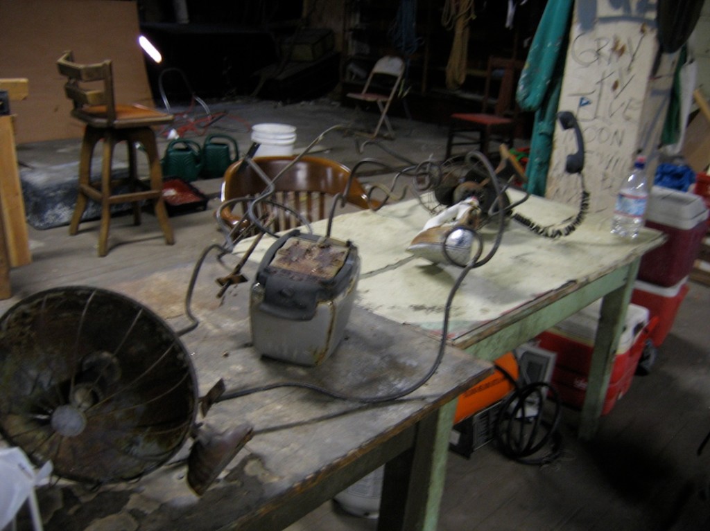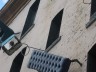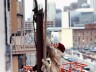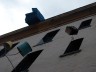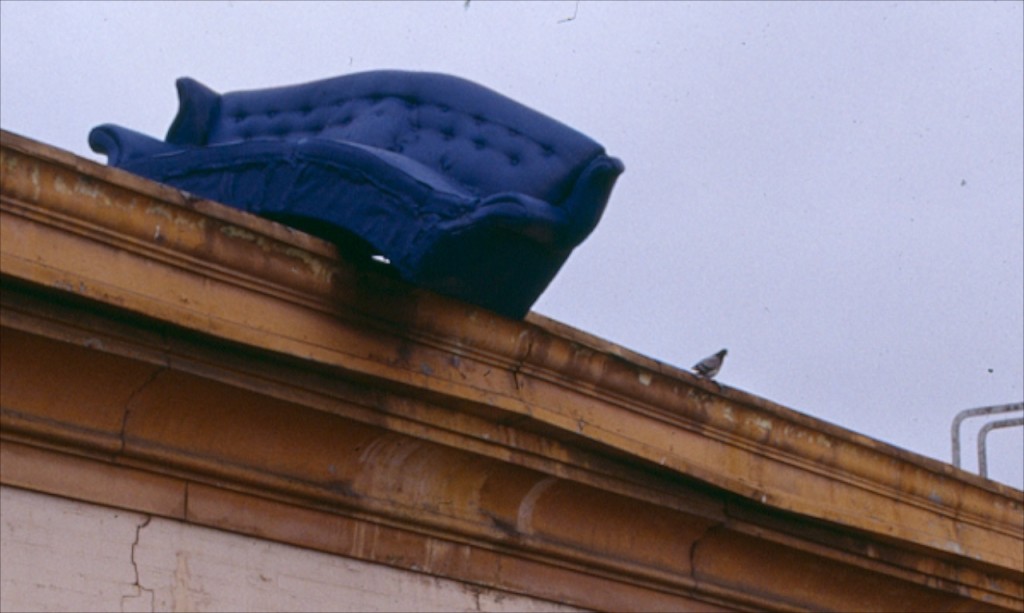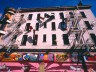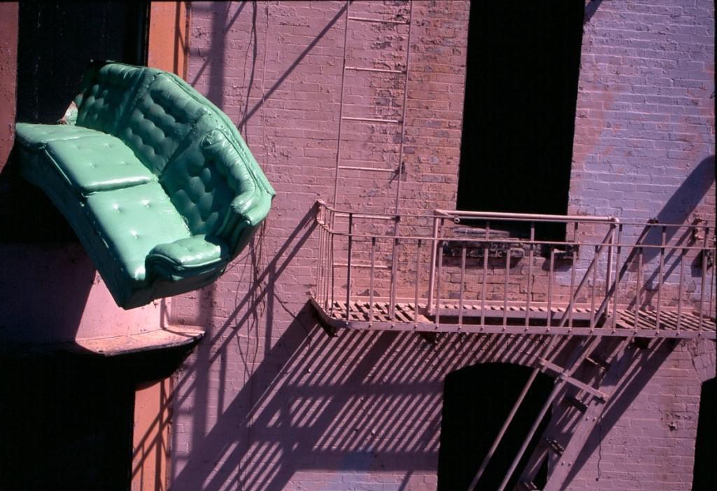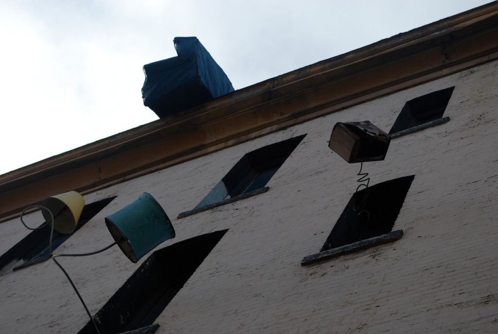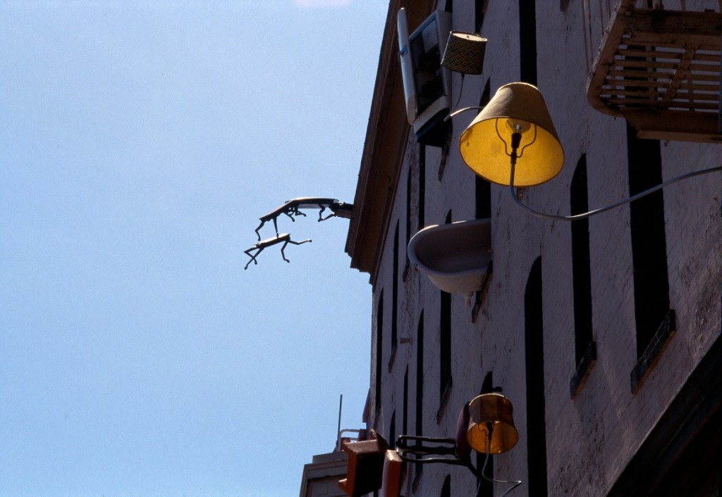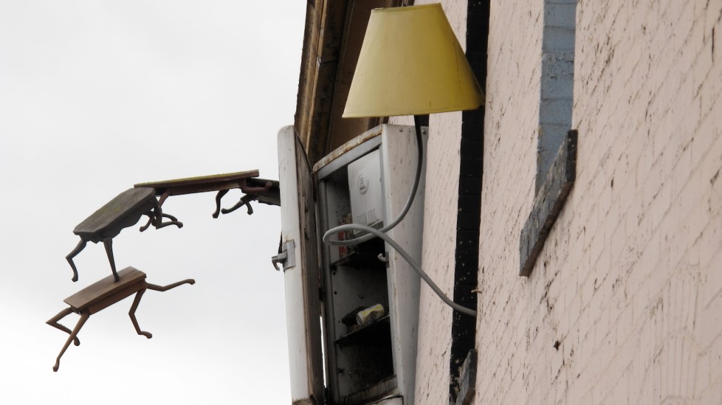This multi-disciplinary sculptural mural involves seemingly animated furniture; tables, chairs, lamps, grandfather clocks, a refrigerator, and couches, their bodies bent like centipedes, fastened to the walls and window-sills, their insect-like legs seeming to grasp the surfaces. Against society’s expectations, these everyday objects flood out of windows like escapees, out onto available ledges, up and down the walls, onto the fire escapes and off the roof. “DEFENESTRATION” was created by Brian Goggin with the help of over 100 volunteers.