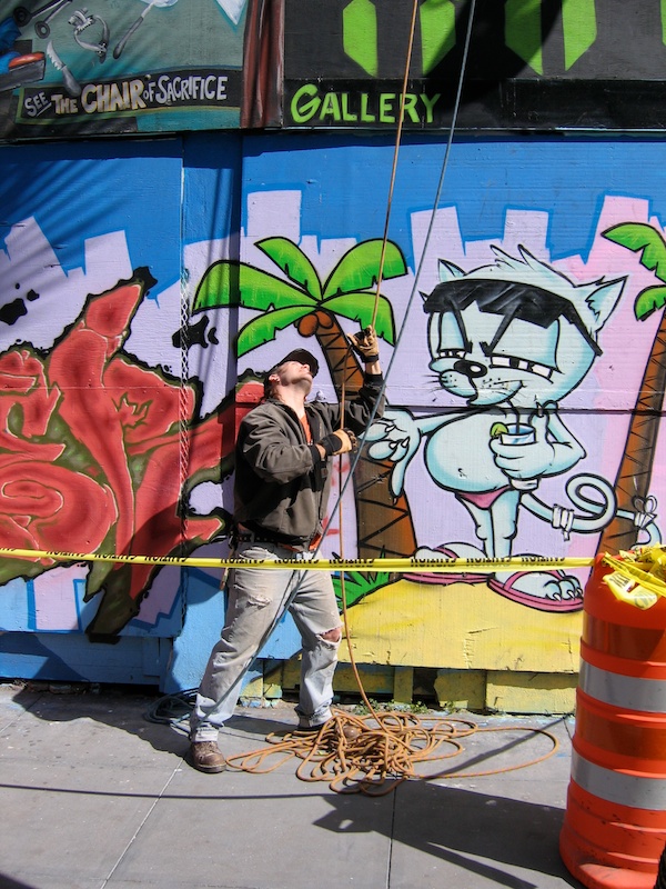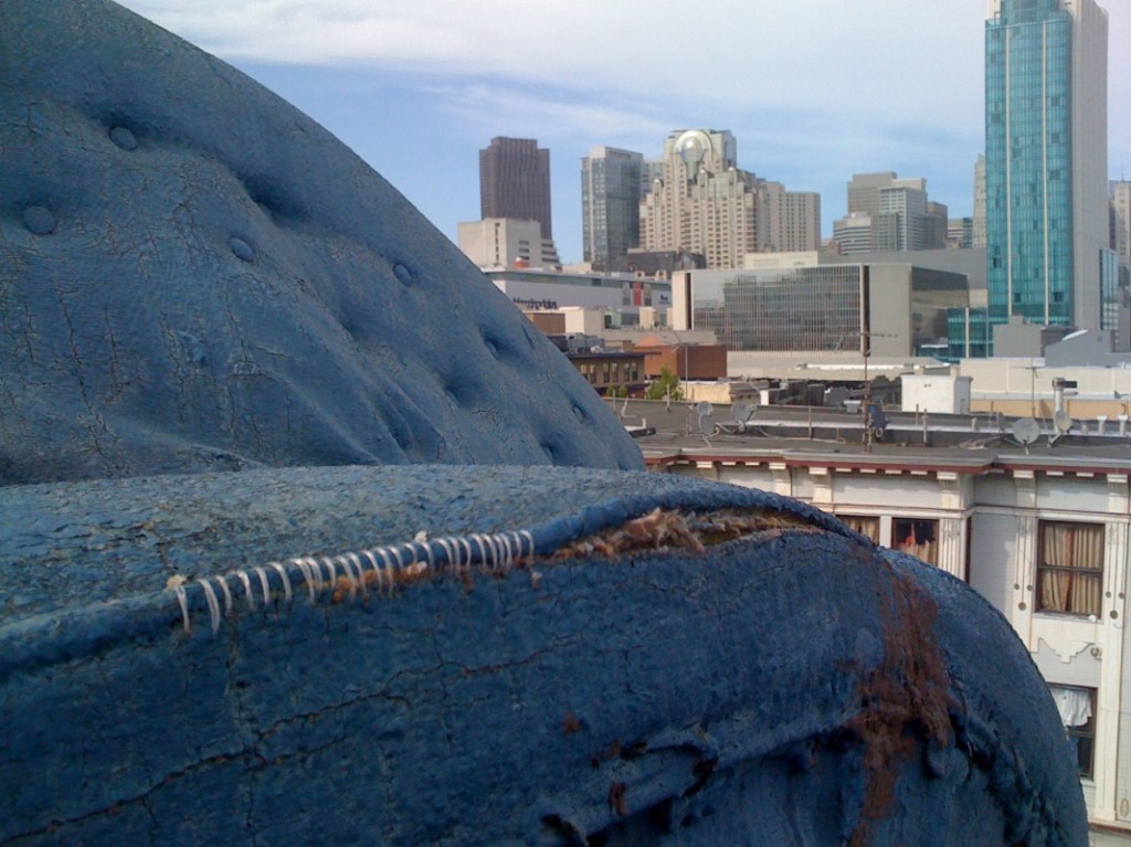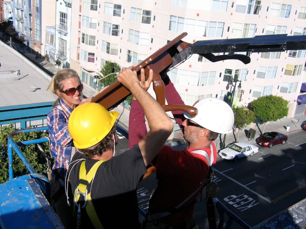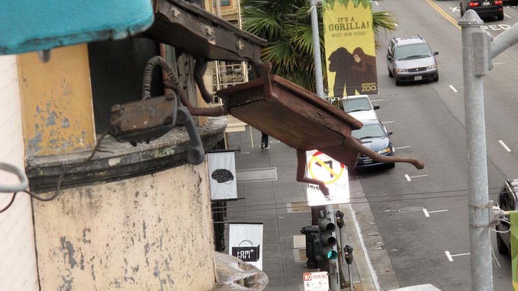 San Francisco City officials let me know I need to move the “Defenestration” project off of it’s perch to make way for affordable housing. Care-taking Defenestration for seventeen years has been a joy, so of course I feel a strong, affectionate relationship with the artwork, the community around it, and the loss, however, it has been a good run for a temporary installation, and we certainly can use more affordable housing here in San Francisco. I begin removing pieces in a little more than one week and can use your help. Varnish Fine Art Gallery and I have partnered up to make the art pieces available to collectors to raise the funds necessary to preserve the work. You may purchase one piece or the whole installation. Please take a moment to look at the online show. Help spread the word if you are able. Varnish can answer all your questions as I untie my ropes.