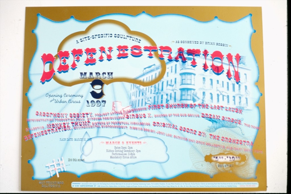 Defenestration has been a lively part of a creative public conversation with the world. I am very pleased we were able to experience the installation for the last seventeen years especially when I originally thought it might last only six months, now I am happy the artworks may find new homes with collectors as part of it’s migration from the hood. – Brian Goggin (May 20, 2014)