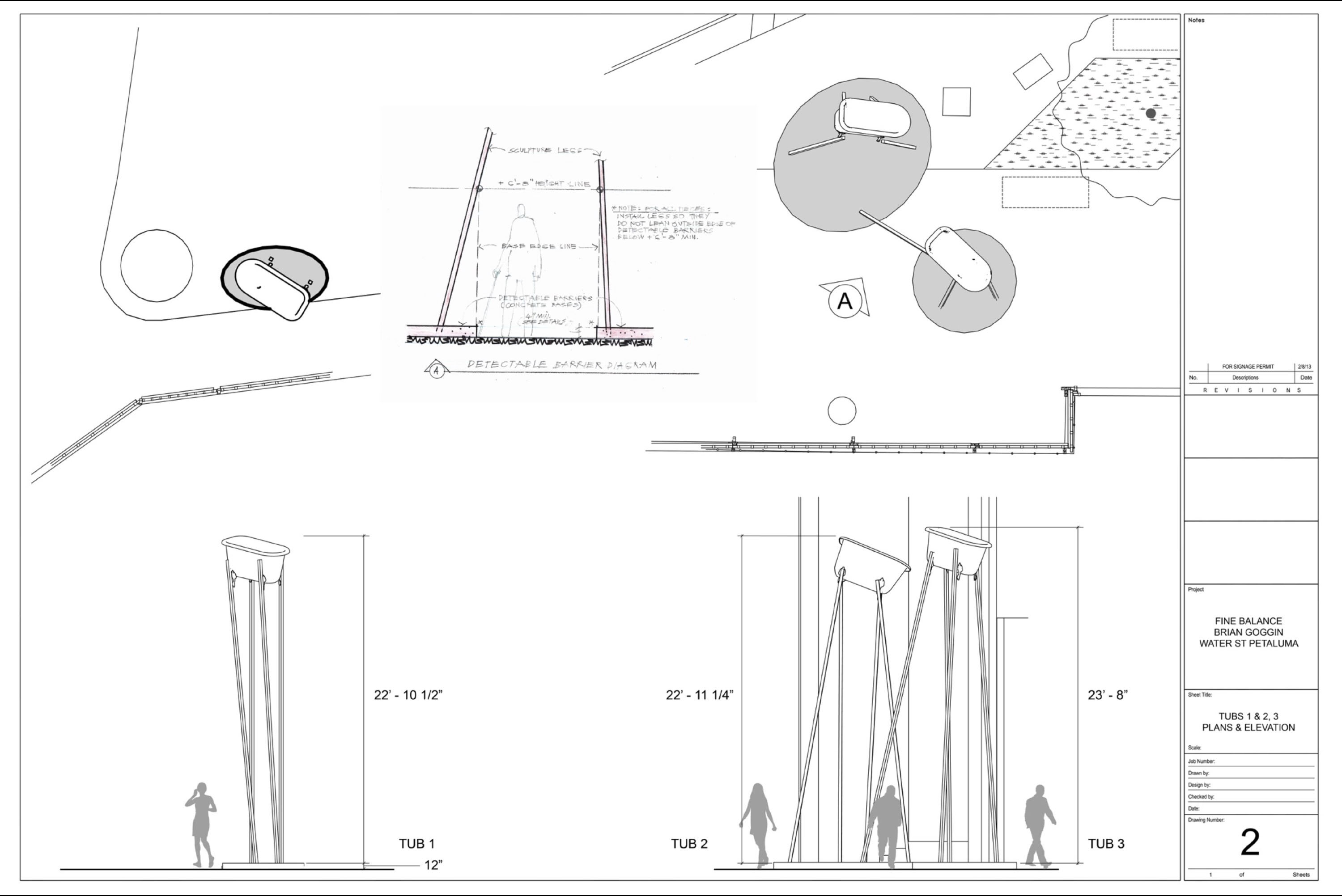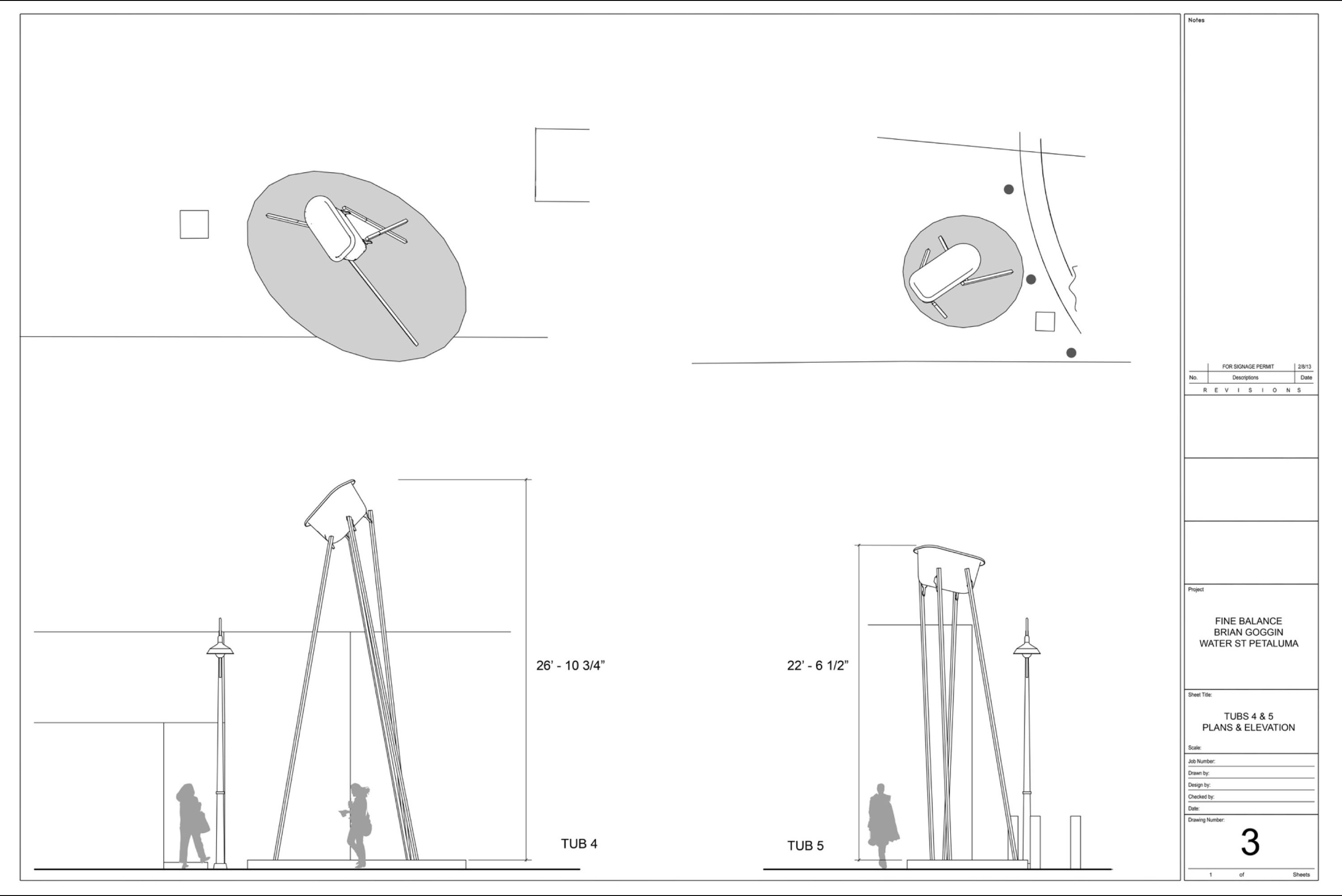 The tub forms delicately balancing on stilts may be seen as a physical expression of the sensitive manner in which Petaluma navigates the path forward, while maintaining its treasured heritage, agricultural roots and eclecticism. During the day the sculptures will create images and shadows on the sidewalk and nearby buildings offering depth and contrast to the composition.
