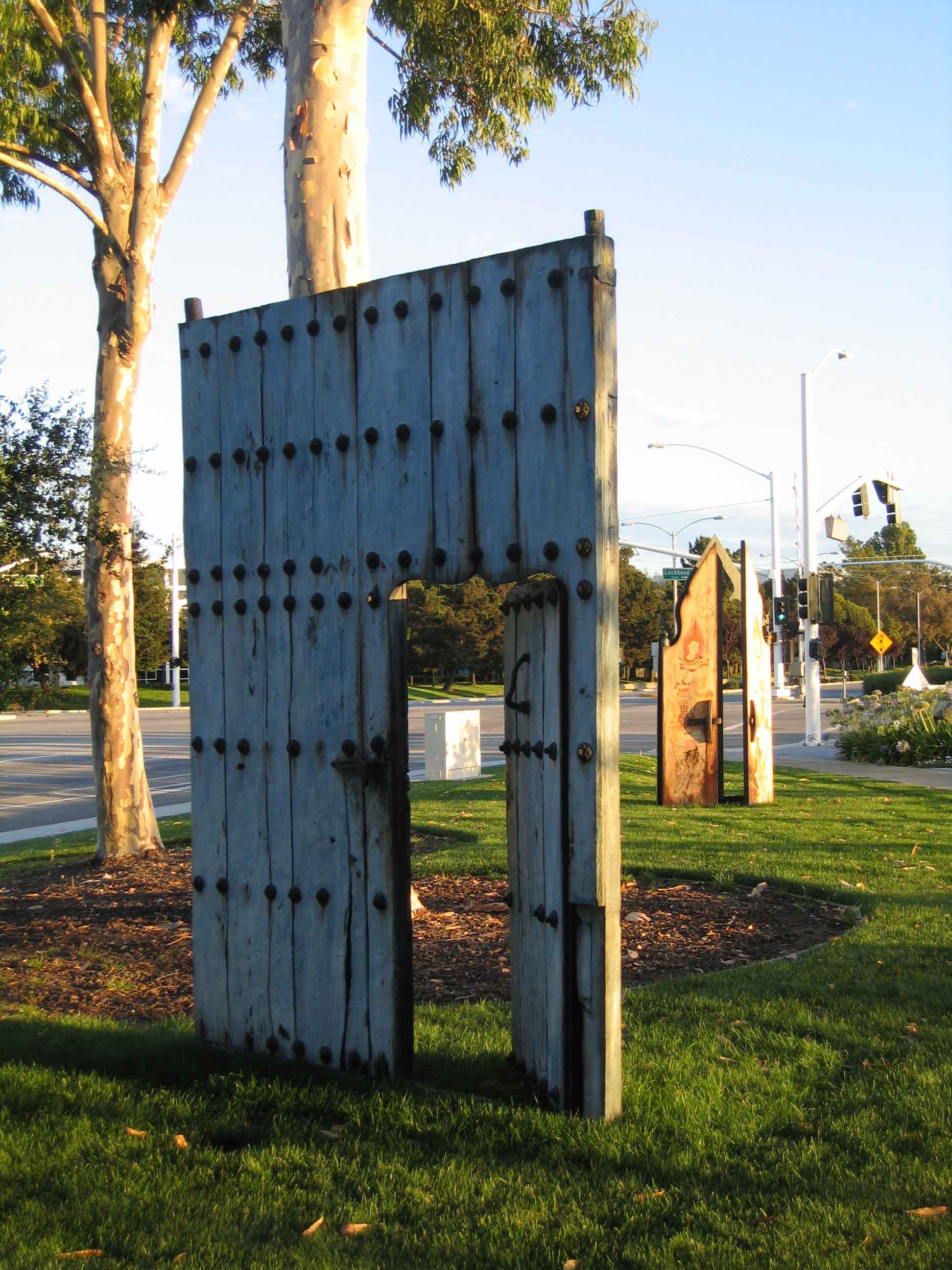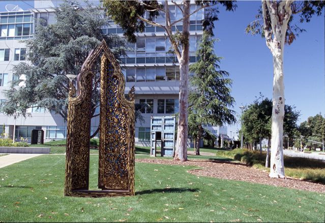 “LABYRINTH” is a site-specific sculptural installation of five portals, arranged on the Yahoo! Headquarters public park, as a web without path or boundary. The portals are full-sized, seemingly random open doors attached to their door frames, each standing in a different part of the grassy, forested landscape. Each of the doors is cast in bronze from actual antiquated doors chosen from five unique cultures throughout the world. Their individual cultural identity is clearly evident in their shape, composition, ornament and symbolic representation. Each visitor may follow a unique personal labyrinth as they meander along their own chosen path, passing through and metaphorically connecting the virtual cultures represented by each of the ancient doorways.