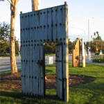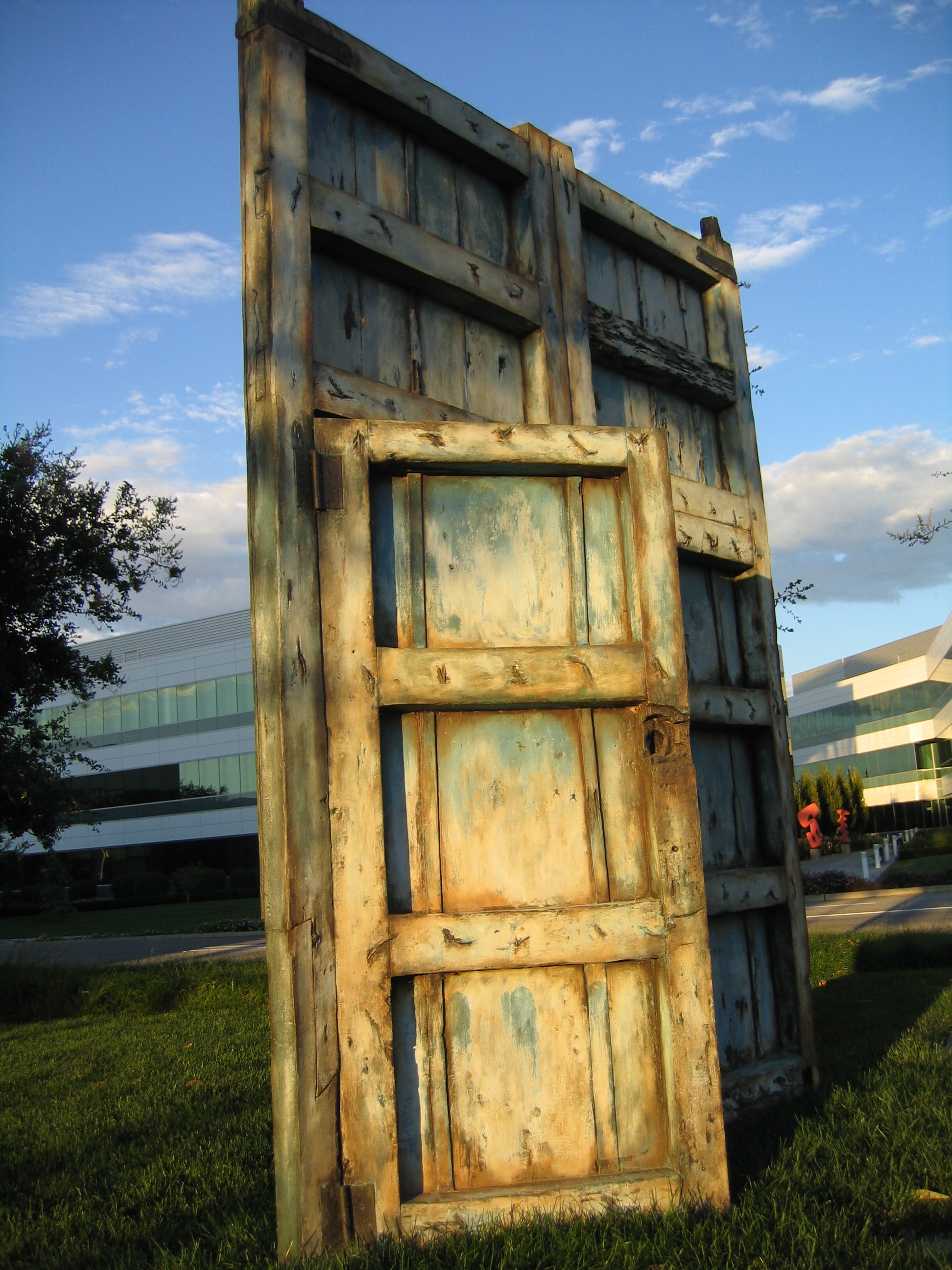 At a larger level, the sculptural environment can be seen as a metaphor for the boundlessly deep and globally diverse World Wide Web itself. The ancient and unique doors might allude to the multitude of web sites offering instantaneous passage to cultures from all corners of the globe. The act of physically walking between doors across the open landscape suggests the movement of a web traveler, seamlessly linking from site to site and culture to culture across the virtual landscape of the Internet.