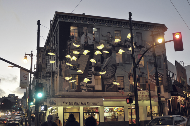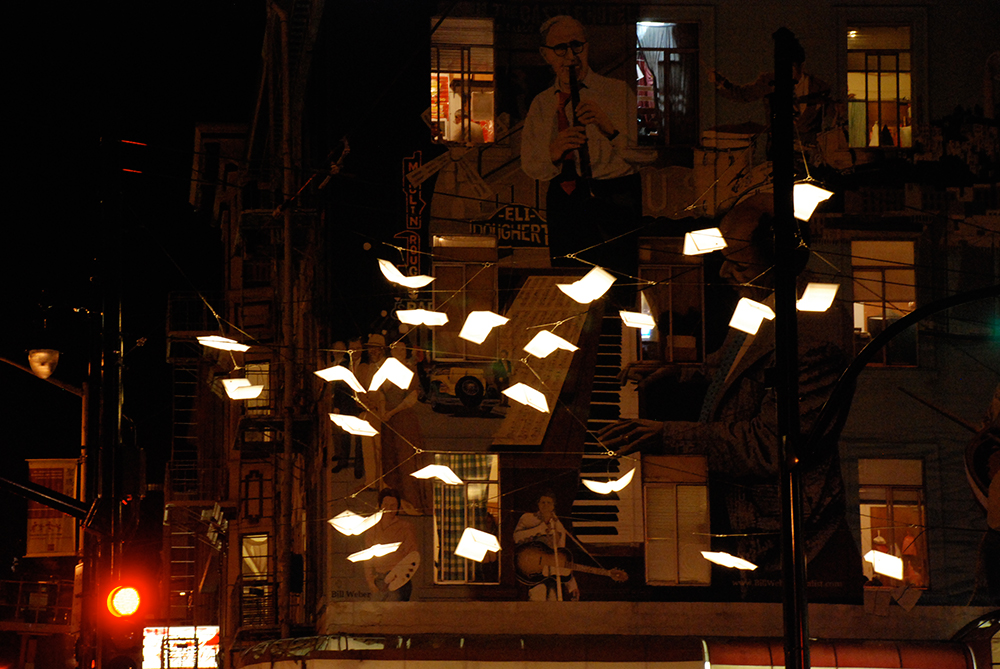 Passing under the flock, pedestrians notice words and phrases embedded in the plaza floor that appear to have fallen from the pages. On closer inspection the fallen words are in English, Italian and Chinese and were selected from the neighborhood’s rich literary history, ranging from the Beats, to SF Renaissance poets and Chinese writers, over 90 authors are represented including Armistead Maupin, Gary Snyder,William T. Vollman, and Jade Snow Wong.