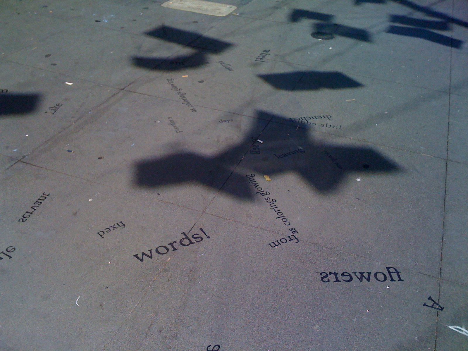 The artists created the design of the plaza floor in Atrium of the SFMOMA. Retaining their original font, individual words from chosen phrases were cast from the third floor gallery of the museum. Words fluttered down 60 feet landing on a paper replica of the plaza thus determining their resting place in the final artwork. Influenced by practices like reading tea-leaves and Japanese gardening techniques. The words intersect in ways that allow for new unique interpretations and meanings.